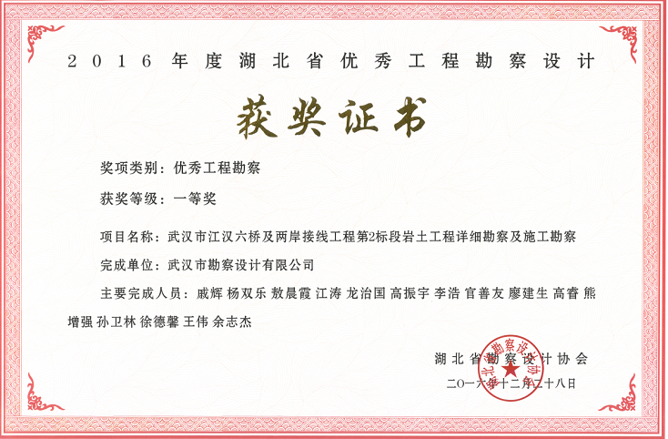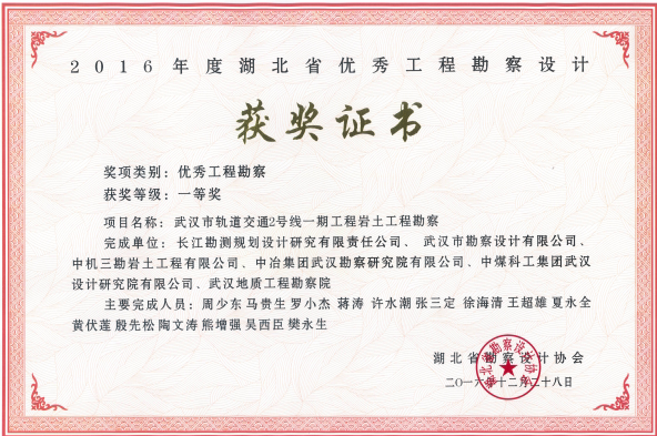 軌道交通2號線一期工程巖土工程勘察獲2016年度湖北省優(yōu)秀工程勘