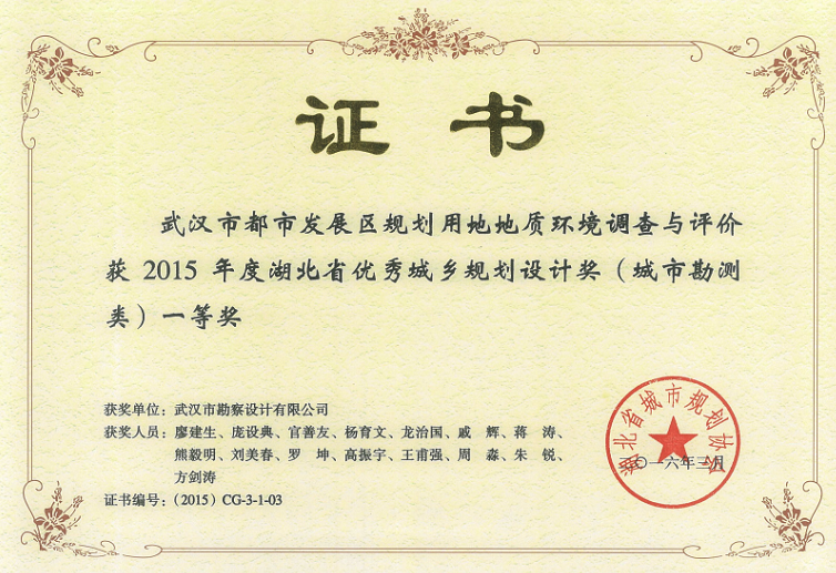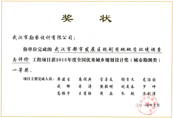 武漢市都市發(fā)展區(qū)規(guī)劃用地地質(zhì)環(huán)境調(diào)查與評價獲2015年度湖北省優(yōu)