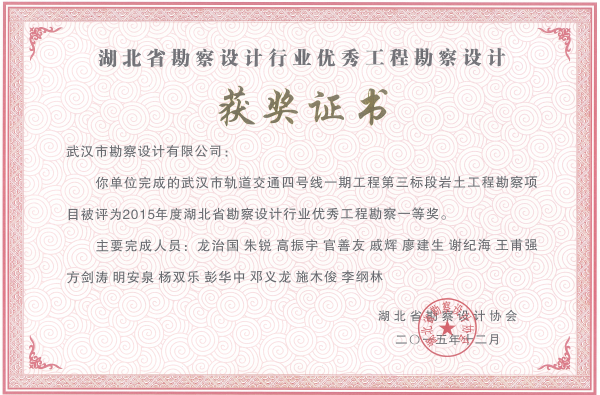 武漢市軌道交通四號線一期工程第三標(biāo)段巖土工程勘察項目獲2015年