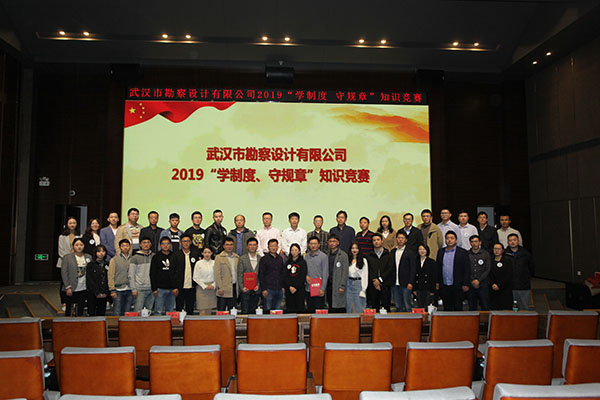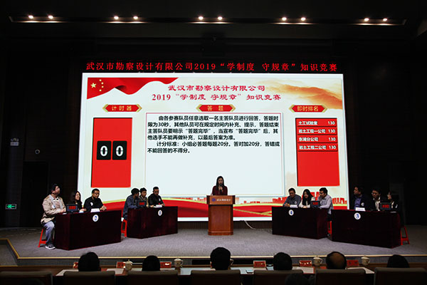 為進(jìn)一步加強(qiáng)員工對(duì)公司企業(yè)文化及各項(xiàng)規(guī)章制度的學(xué)習(xí)和認(rèn)識(shí),提高員工的綜合素養(yǎng),10月30日上午,公司首次舉辦的2019年度“學(xué)制度 守規(guī)章”知識(shí)競(jìng)賽活動(dòng)在測(cè)繪院307學(xué)術(shù)報(bào)告廳成功舉辦。公司董事長廖建生,總經(jīng)理施木俊,副總經(jīng)理安永強(qiáng)、官善友、蔣濤,代理副總經(jīng)理熊劍,代理總會(huì)計(jì)師龔瑋親臨現(xiàn)場(chǎng)指導(dǎo)并觀看了比賽,公司各部門負(fù)責(zé)人及員工代表共計(jì)100余人參加了活動(dòng)。巖土工程一公司、巖土工程二公司、測(cè)繪工程公司、基礎(chǔ)工程公司、檢測(cè)監(jiān)測(cè)公司、設(shè)計(jì)中心、地質(zhì)環(huán)境中心、不動(dòng)產(chǎn)咨詢中心、東湖分公司、新區(qū)分公司、臨空分公司、土工試驗(yàn)室等12支生產(chǎn)部門代表隊(duì)共36名選手參加了此次比賽。