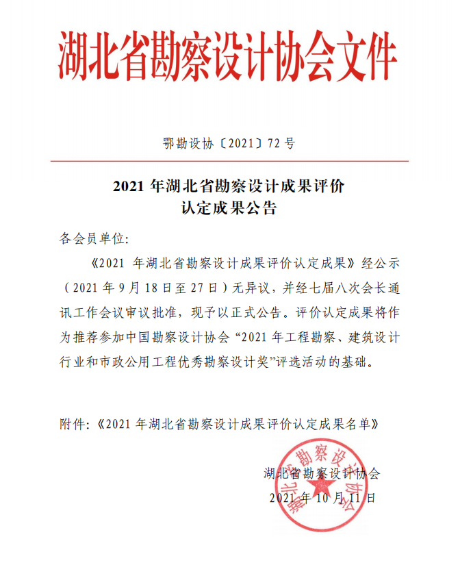 10月11日,湖北省勘察設(shè)計協(xié)會正式發(fā)布《2021年湖北省勘察設(shè)計成果評價認(rèn)定成果公告》,公司實施的5個項目分別榮獲工程勘察組一二三等獎。
