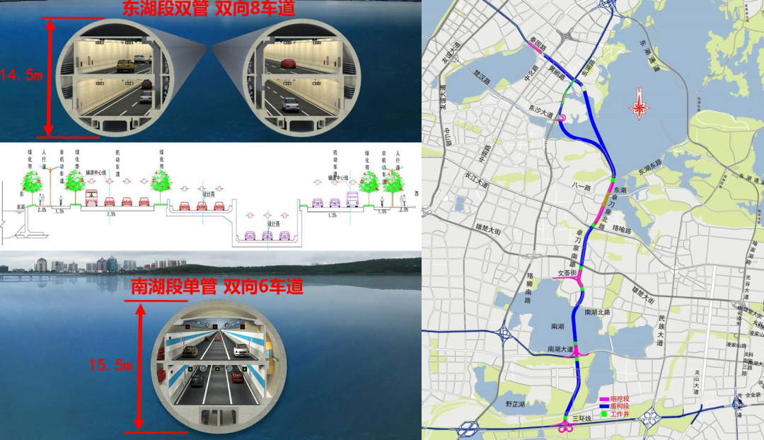 為更好地支撐城市空間發(fā)展,武漢市“十三五”規(guī)劃中要求“加大地下空間開發(fā)利用度,加強(qiáng)地下通道、地下停車場等地下交通設(shè)施建設(shè),啟動實施‘負(fù)高架’工程,改善交通出行條件”。兩湖隧道作為世界上規(guī)模最大的城市湖底雙層超大直徑隧道,是武漢市重點市政工程,也是惠及武漢千家萬戶的重大民生工程。項目建成后,將在武昌片區(qū)形成一條南北向快速通道,可有效緩解二環(huán)線、珞獅南路、水果湖隧道等道路交通壓力,不斷完善區(qū)域路網(wǎng)體系,方便周邊地區(qū)居民出行。