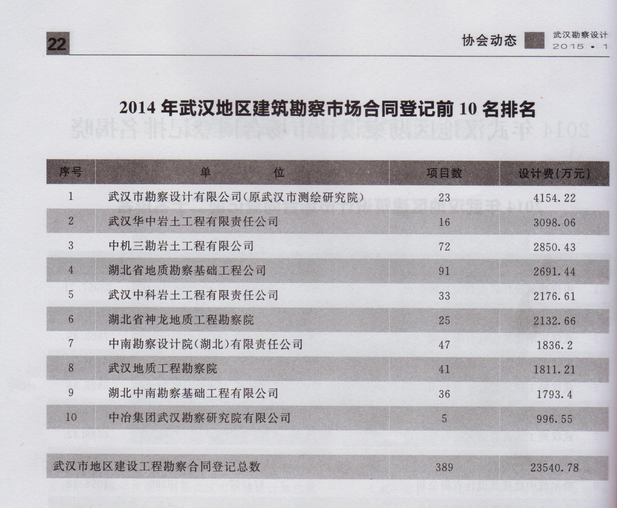 根據(jù)武漢市勘察設(shè)計(jì)協(xié)會(huì)出版的《武漢勘察設(shè)計(jì)》雜志2015年第一期刊登的最新統(tǒng)計(jì),武漢市勘察設(shè)計(jì)有限公司2014年全年的勘察合同登記總金額達(dá)到4154.22萬(wàn)元,再次名列武漢地區(qū)第一名。我公司在2012、2013、2014年已連續(xù)三年位居武漢地區(qū)建筑勘察市場(chǎng)合同登記前10名排名的榜首。 (綜合部)