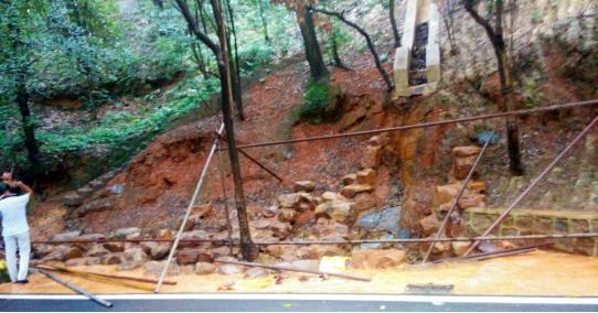 7月3日中午12點左右,接江夏區(qū)建設(shè)局通知,江夏青龍山林場內(nèi)出現(xiàn)邊坡垮塌險情。常務副總施木俊帶領(lǐng)周淼、徐光耀、夏水江等技術(shù)人員趕赴現(xiàn)場參與應急處理工作。經(jīng)現(xiàn)場勘查發(fā)現(xiàn),青龍山林場靠青龍路和醉江月度假村一側(cè)山體邊坡出現(xiàn)局部垮塌,垮塌土體散落于青龍路一側(cè),影響了道路通行。公司應急搶險團隊和相關(guān)單位一起勘察現(xiàn)場后,指出由于連日暴雨,雨水長期沖刷造成邊坡前緣土體局部垮塌,是否有張拉裂隙需進一步勘察確定,提出了進行削方處理的建議。