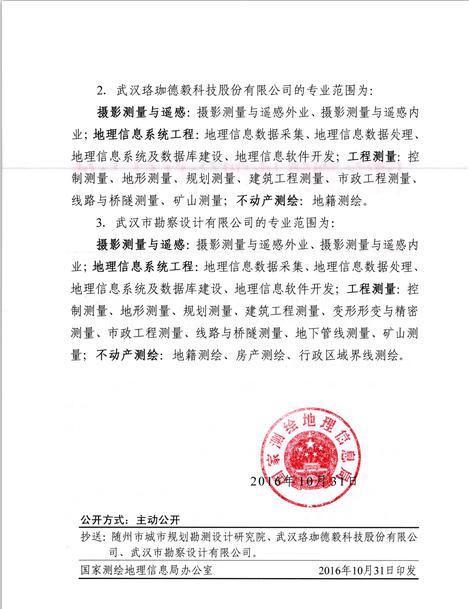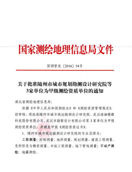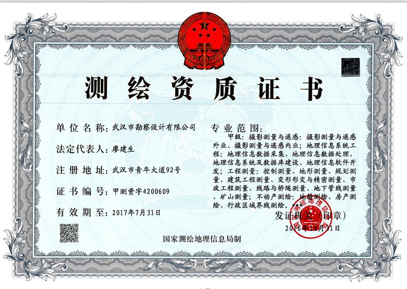 日前,經(jīng)湖北省測(cè)繪地理信息局審查推薦、國(guó)家測(cè)繪地理信息局審核批準(zhǔn),武漢市勘察設(shè)計(jì)有限公司榮獲甲級(jí)測(cè)繪資質(zhì)證書(shū)。自此我公司甲級(jí)測(cè)繪業(yè)務(wù)將全面覆蓋攝影測(cè)量與遙感、地理信息系統(tǒng)工程、工程測(cè)量、不動(dòng)產(chǎn)測(cè)繪等專(zhuān)業(yè)范圍。