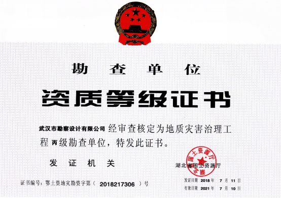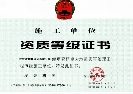 近日,湖北省國土資源廳發(fā)布了關(guān)于2018年度地質(zhì)災(zāi)害危險(xiǎn)性評(píng)估和治理工程資質(zhì)(新立、升級(jí))審批結(jié)果的公告,公司地質(zhì)災(zāi)害危險(xiǎn)性評(píng)估和地質(zhì)災(zāi)害治理工程勘查、設(shè)計(jì)、施工資質(zhì)申請(qǐng)一次性順利通過國土資源部審核,并成功取得了資質(zhì)證書。