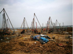 佳兆業(yè)·悅府項目一期C地塊位于武漢市東西湖區(qū)吳新干線與三店大道交叉口,項目規(guī)劃30余棟建筑物,一期C地塊8棟建筑物的詳勘報告顯示,擬建場地內(nèi)白云巖中發(fā)育有巖溶,受業(yè)主委托,我公司于2018年4月10日進場開始該項目施工勘察(超前鉆)的外業(yè)工作,先后共投入鉆機35臺,按設(shè)計要求完成一期C地塊共計8棟住宅樓572根樁的一樁一孔施工勘察(超前鉆)任務(wù)。