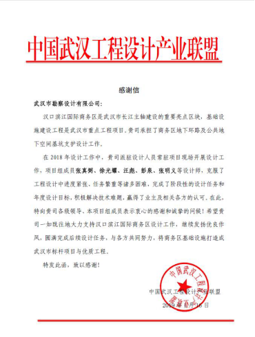 2019年1月21日,中國(guó)武漢設(shè)計(jì)產(chǎn)業(yè)聯(lián)盟向我司發(fā)來感謝信,對(duì)漢口濱江國(guó)際商務(wù)區(qū)基坑支護(hù)設(shè)計(jì)項(xiàng)目組成員一年來辛勤而卓有成效的工作表示感謝,這封感謝信代表了設(shè)計(jì)產(chǎn)業(yè)聯(lián)盟對(duì)我司設(shè)計(jì)工作的充分認(rèn)可。