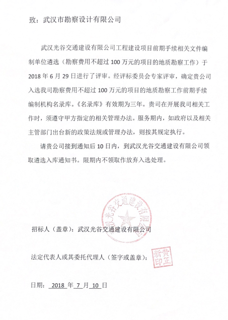 2018年6月29日,經(jīng)投標(biāo),我公司成功入選武漢光谷交通建設(shè)有限公司勘察費(fèi)用不超過(guò)100萬(wàn)元的項(xiàng)目地質(zhì)勘察工作,服務(wù)期限為三年。 武漢光谷交通建設(shè)有限公司主要業(yè)務(wù)范圍為城市地鐵、有軌電車、公交系統(tǒng)等公共交通項(xiàng)目的建設(shè)、運(yùn)營(yíng)管理;重大交通建設(shè)項(xiàng)目、重大...