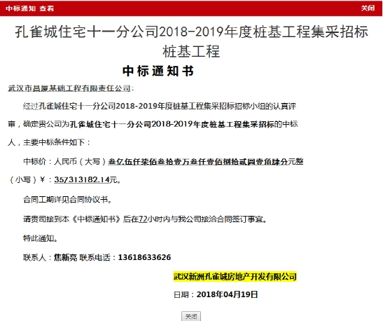 2018年4月19日,我司經(jīng)過多輪競爭報(bào)價(jià),成功中標(biāo)孔雀城住宅十一分公司2018-2019年度樁基工程集采招標(biāo)樁基工程,中標(biāo)價(jià)為3.57億元。 與武漢新洲孔雀城房地產(chǎn)開發(fā)有限公司合作,是我公司繼保利地產(chǎn)(集團(tuán))股份有限公司、萬科房地產(chǎn)(集團(tuán))股份有限公司、金地...
